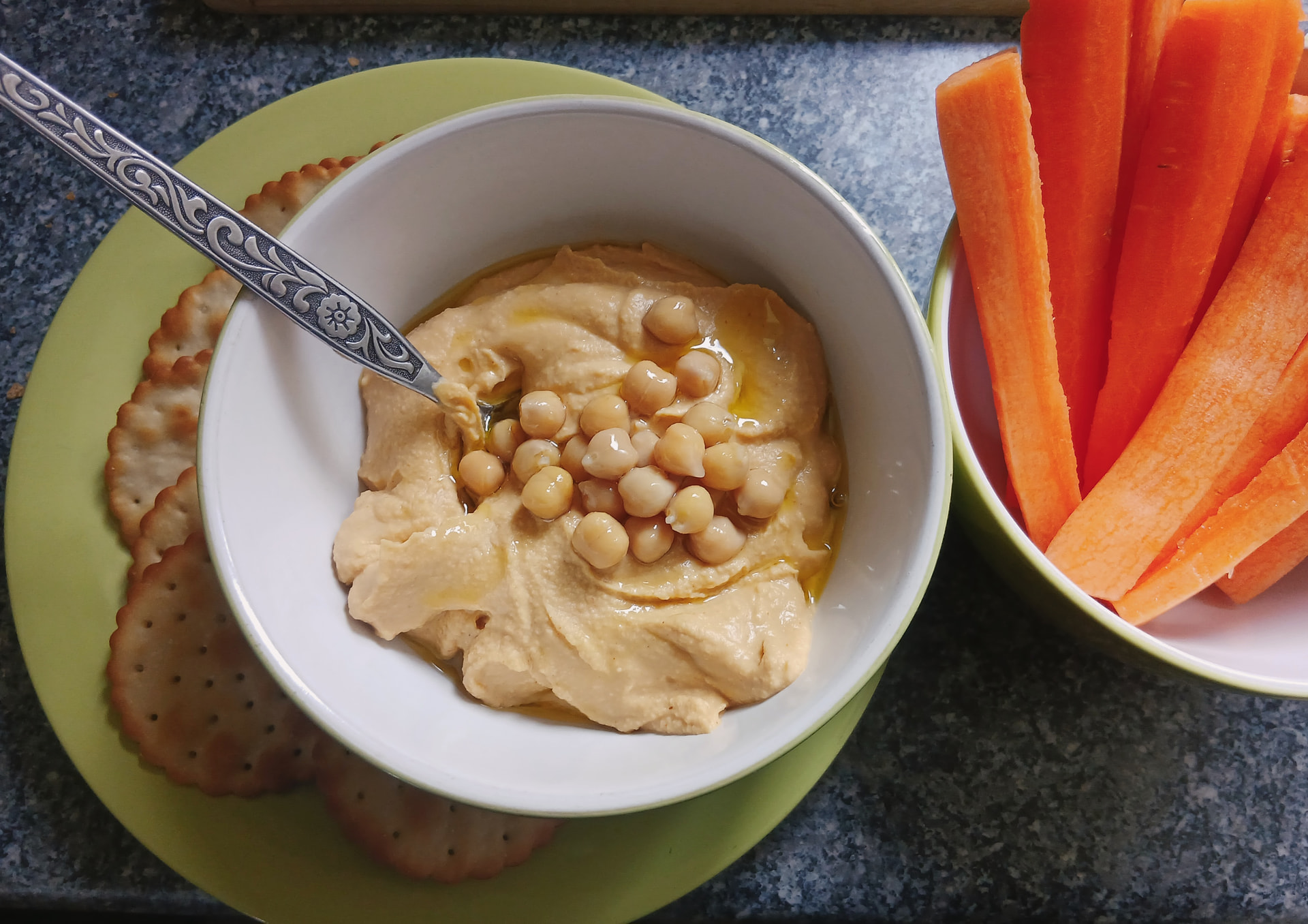 I had some carrots looking at me from the fridge so I made hummus for the first time. High protein, high fibre