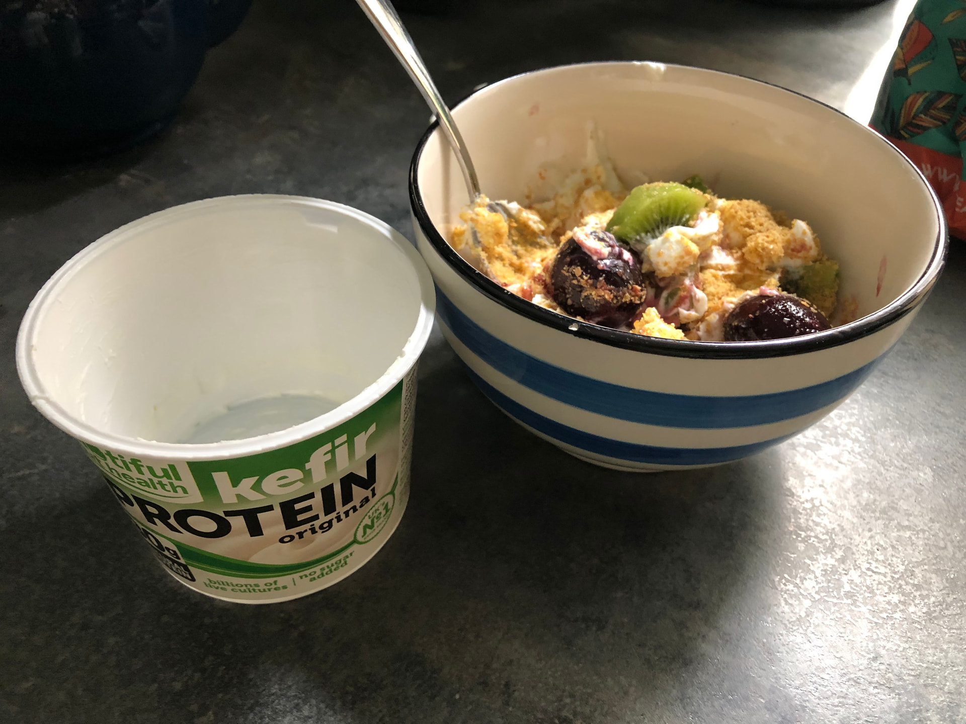 ), kefir protein plain yoghurt, defrosted frozen cherries (Sainsbury’s has a 3 for 2 offer making them affordable), kiwi and milled flaxseed. Loads of protein and fruit for neutrophils. Very quick and easy to put together.