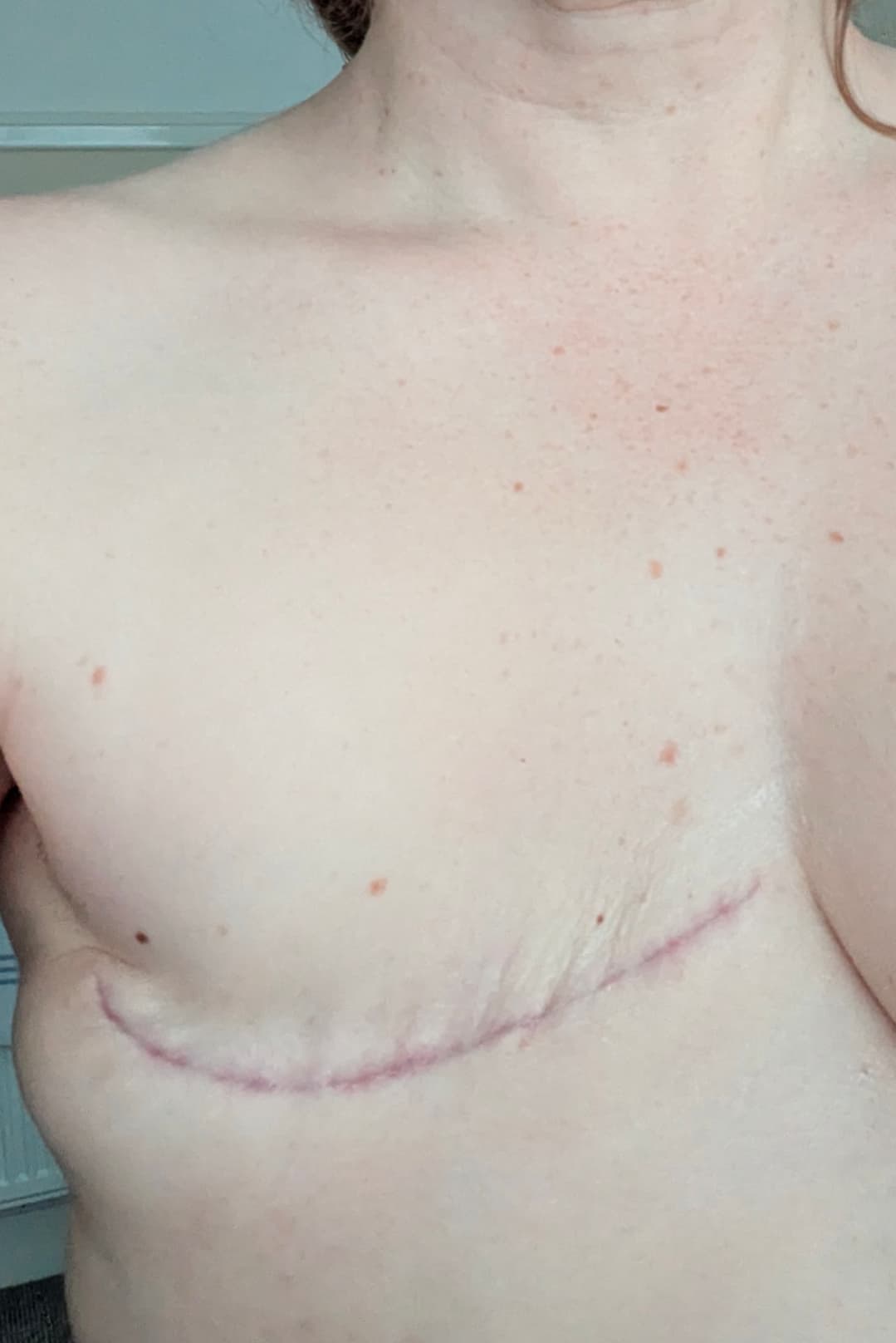 fast forward to now and although I had a few wobbles where I wondered if I’ve made a mistake not having a reconstruction I can honestly say that I’m really happy with my operation scar. I know that sounds absolutely crazy to say it but it’s actually a beautifully neat scar. My surgeon did a fantastic job . I have a smile shaped surgery site but the scar has faded so well , actually if I stood from a distance you would barely spot it now I have a small flap of skin that hangs a bit just under my arm but that’s probably because I was a bit overweight anyway and that’s where they remove the sentinel nodes, Looking directly on. There’s no lumps , there’s no bumps there’s no dog ears or anything. I’m really quite pleased with it , a few months after my surgery I started just rubbing massage oil into the area also just to hope to try and get some sensation back as I have been left with some numbness there which I’ve been told is quite normal and doesn’t impact on my daily life although I do get some strange sharp pains in there from time to time which again I’ve been told is perfectly normal.